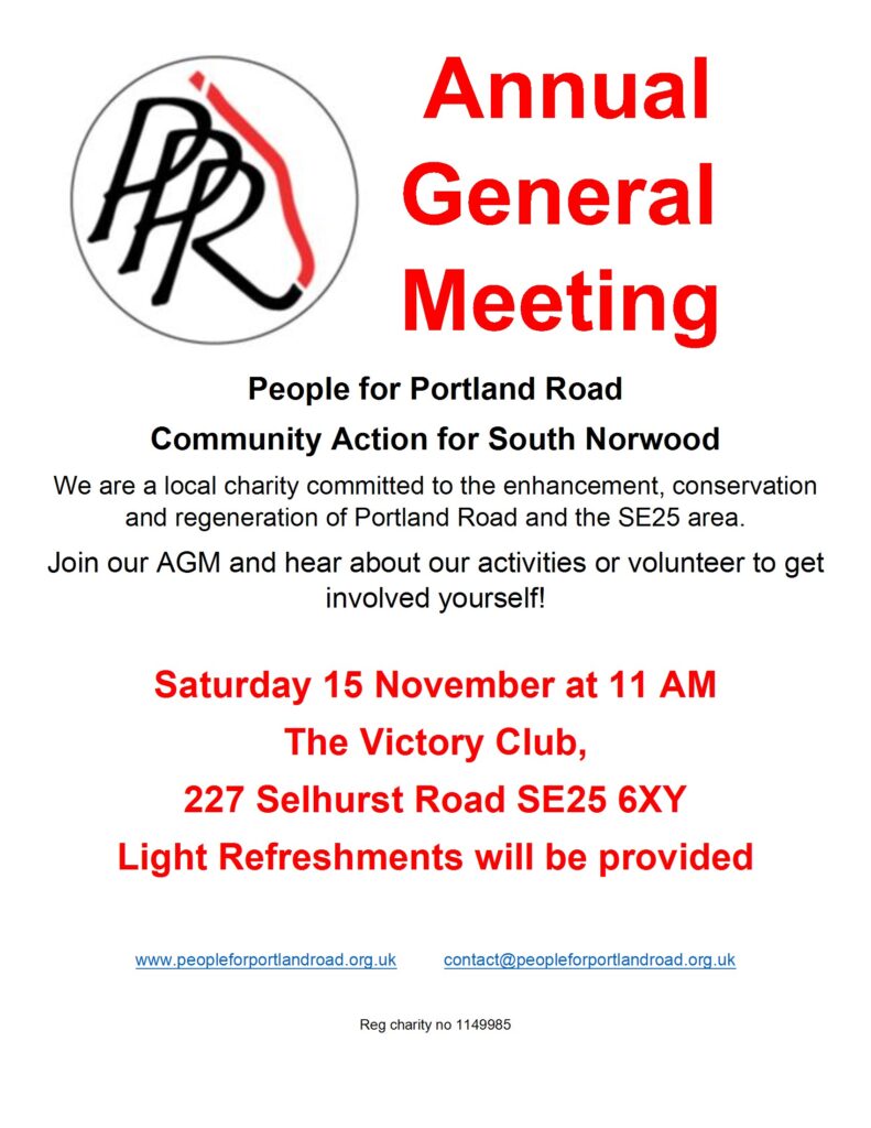The meeting will be held at The Victory Club, 227 Selhurst Road SE25 6XY (opposite South Norwood Library) If you would like to join our Steering Group, please get in contact via our email (contact@peopleforportlandroad.org.uk). New people will be welcomed!